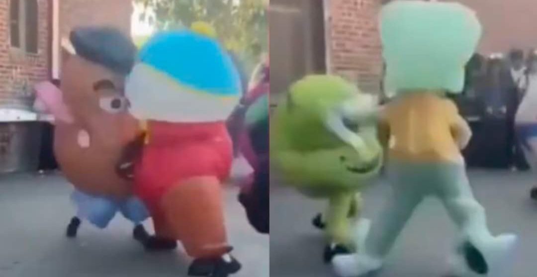Según se ve en un video que se hizo viral, quienes llevaban los disfraces de Señor Cara de Papa y Eric Cartman comenzaron a golpearse durante lo que era una presentación pensada para chicos.
